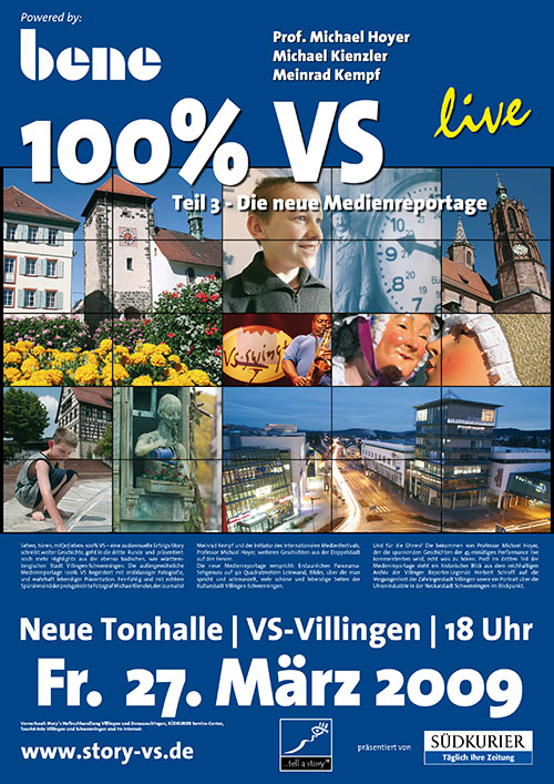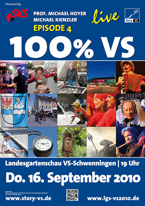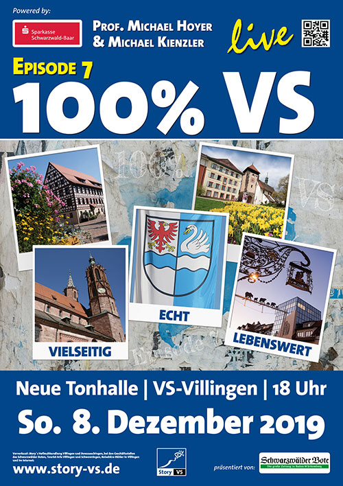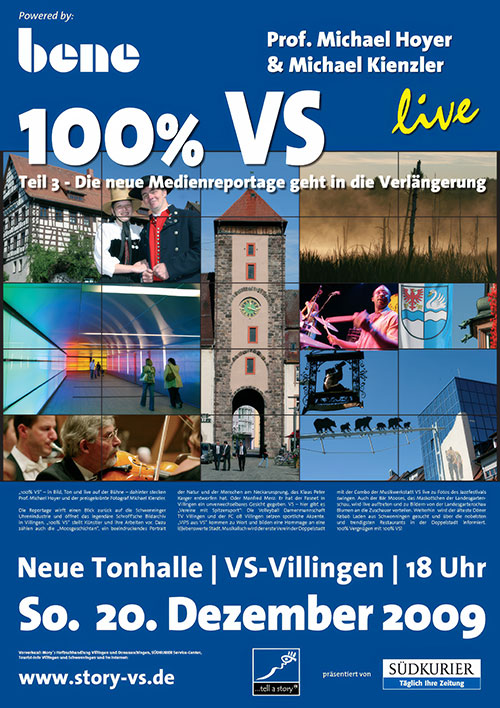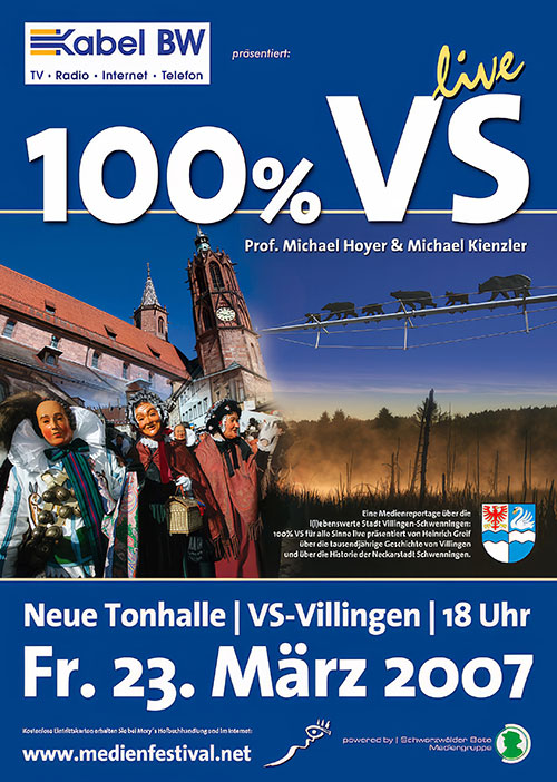 Mit der Medienreportage 100 % VS haben Professor Michael Hoyer und der preisgekrönte Fotograf Michael Kienzler der Doppelstadt Villingen-Schwenningen ein ganz eigenes Gesicht verliehen. Die außergewöhnliche Multivisionsshow, welche bereits mehrfach in der Neuen Tonhalle in Villingen-Schwenningen aufgeführt wurde, besticht mit Live-Acts, Geschichten und Bildern, die den Betrachter in das Stadtgeschehen eintauchen lassen. Das Portrait über die Doppelstadt, welches immer wieder Neues zu berichten hat, überzeugt mit Vielfältigkeit, Divergenzen zwischen Tradition und Moderne,
