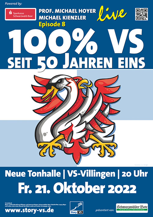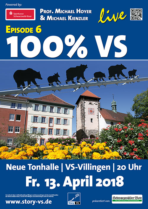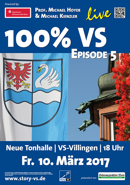 Sportgeist, besonderem Handwerk und VS-Feinkost, einer verrückten fünften Jahreszeit, Heimathelden, reizvollen Sehenswürdigkeiten uvm.100% VS – steht für einen Abend bester Unterhaltung. Scharfsinnig, informativ, mit Witz und einem Augenzwinkern, begleitet Michael Hoyer in seinen audio-visuellen Live-Multivisionen „100% VS“ die Zuschauer mit zahlreichen Live-Acts durch eine Doppelstadt voller Kontraste, pfiffiger Geschichten und jeder Menge Aha-Erlebnisse. Was bedeutet eigentlich VS? ViSion – Very Superior –VerSus? Villingen-Schwenningen!